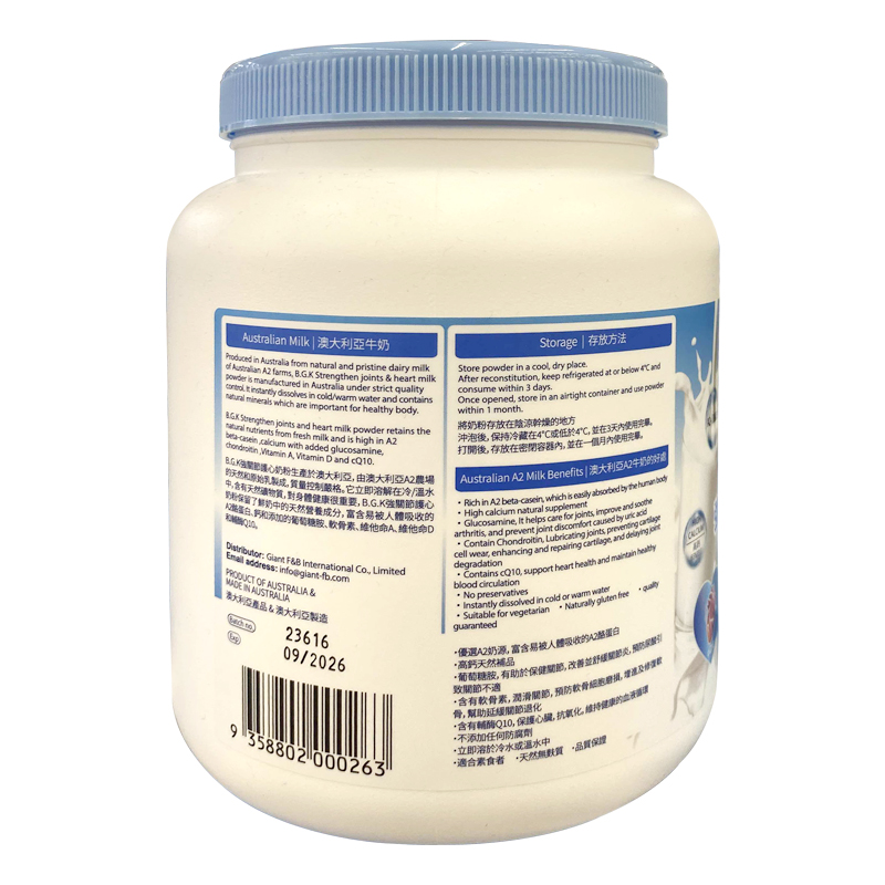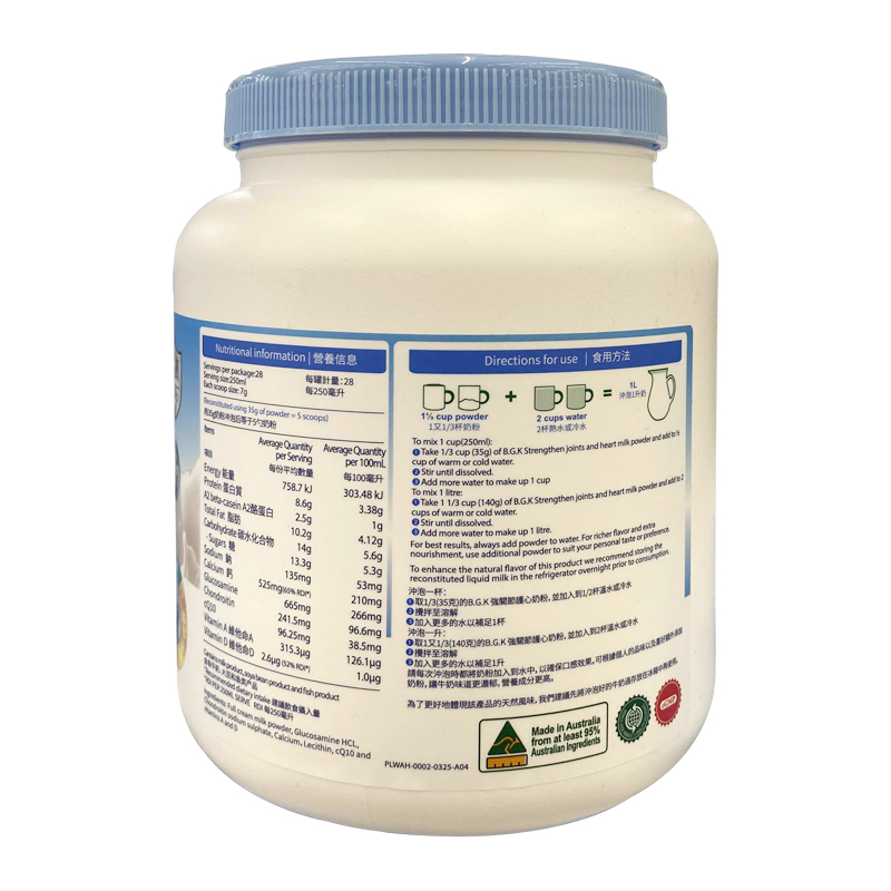 A2全脂奶粉 99%,氨基葡萄糖盐酸盐 0.3%, 鲨鱼软骨素 0.2%,辅酶q10 0.04%, 维生素A 0.25%,维生素d 0.01%,钙 0.2%