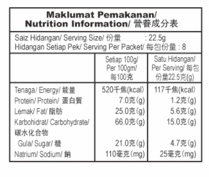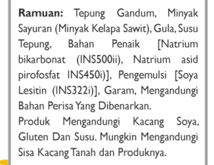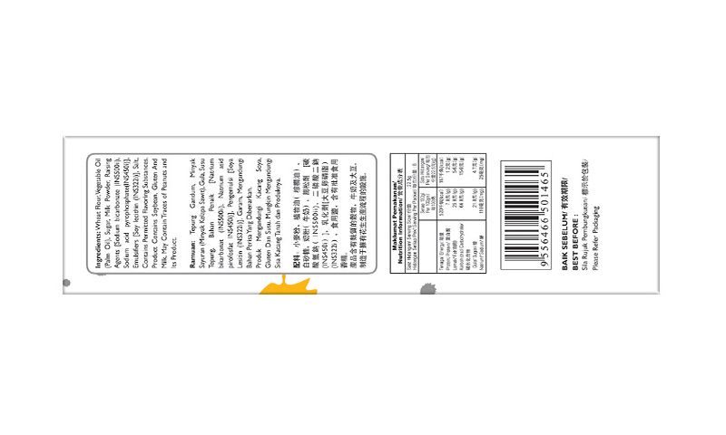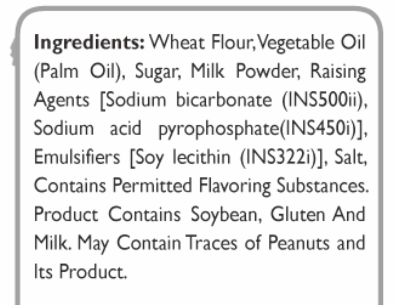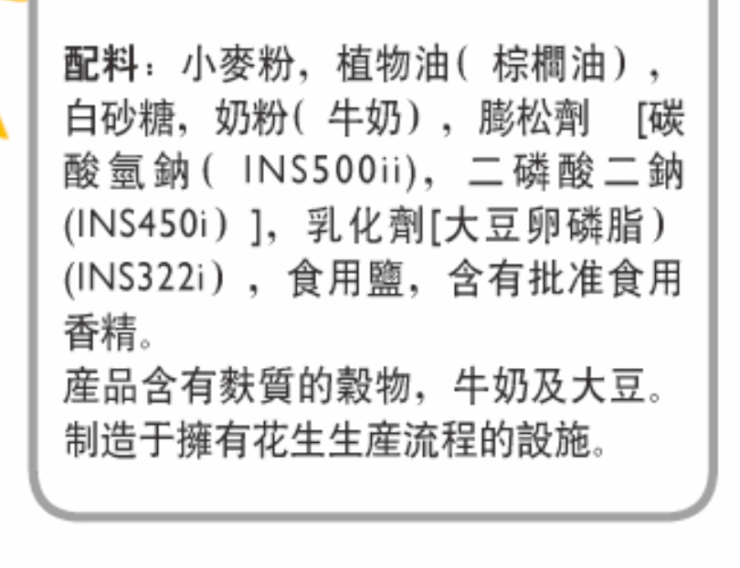 31.6%小麦粉,31%植物油(棕榈油),26.4%白砂糖,6.2%奶粉(牛奶),3%膨松剂[碳酸氢钠(INS500ii),1%二磷酸二钠(INS450i)],0.5%乳化剂[大豆卵磷脂(INS322i),0.2%食用盐,0.1%含有批准食用香精