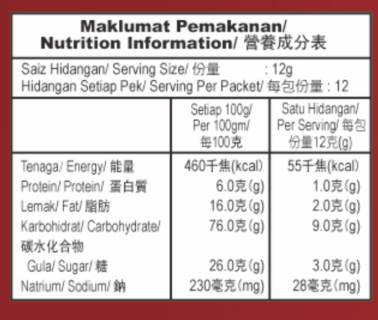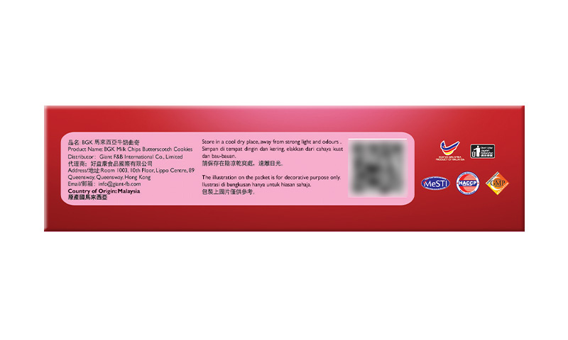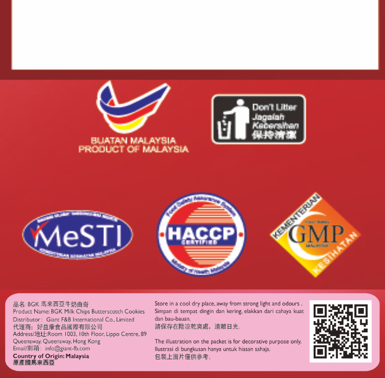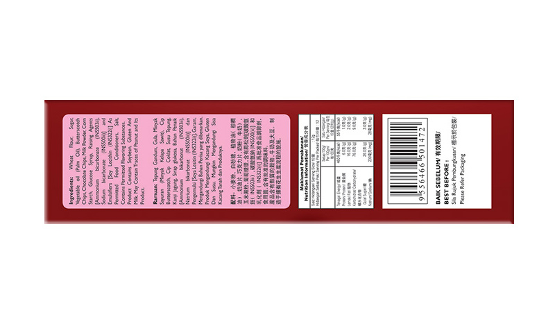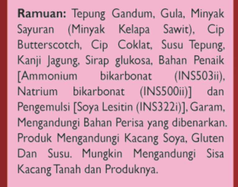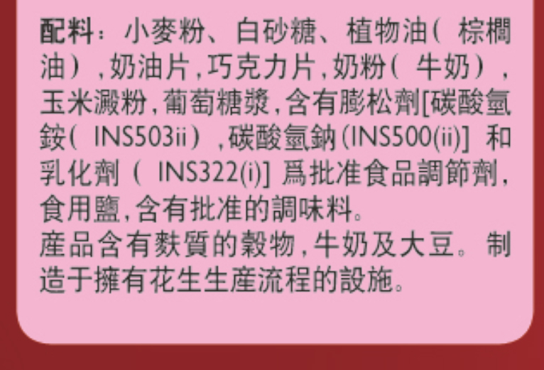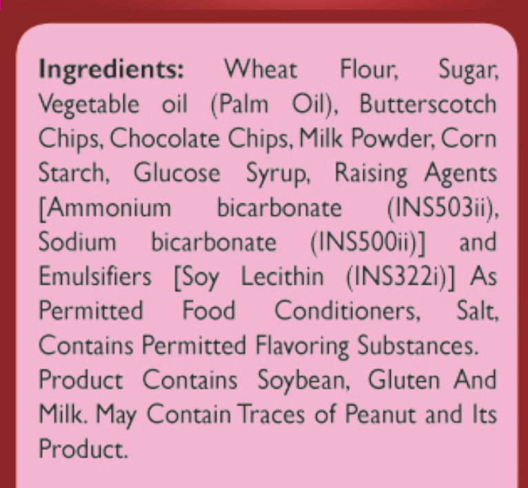 45%小麦粉,18%白砂糖,9%植物油( 棕榈油),6%奶油片,6%巧克力片,6%奶粉( 牛奶),4%玉米淀粉,2%葡萄糖浆,2%碳酸氢钠(INS500(ii)],1%含有膨松剂[碳酸氢铵(INS503ii),0.6%乳化剂(INS322i),0.3%食用盐,0.1%含有批准的调味料